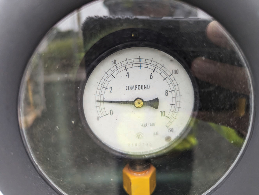 The most basic on-line assessment for an SF6 unit is visual inspection, and perhaps nothing is more important during a visual inspection than checking the pressure gauge. Figure 3 shows an SF6 pressure gauge of an energized 121-kV circuit breaker, with the needle sitting at around 15 psig, well below the minimum acceptable pressure of 57 psig according to the data plate.