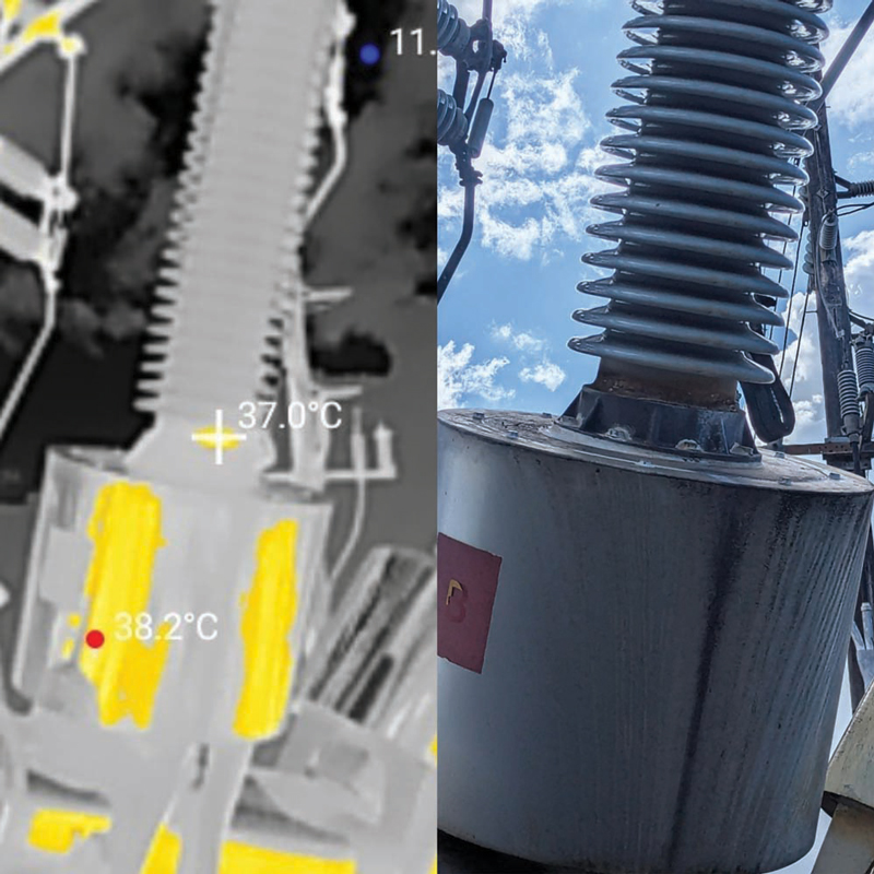 Infrared thermography is my favorite tool due to its wide applicability and accessibility. A wide range of defects developing unbeknownst to asset owners can be discovered during an infrared survey, including an anomaly I discovered in the same substation as the low gas pressure incident. Figure 4 shows a thermogram as well as a visible image of what appears to be partial discharge occurring at the camera crosshairs just above the flange and just below the last insulator skirt of a 121-kV SF6 breaker bushing.