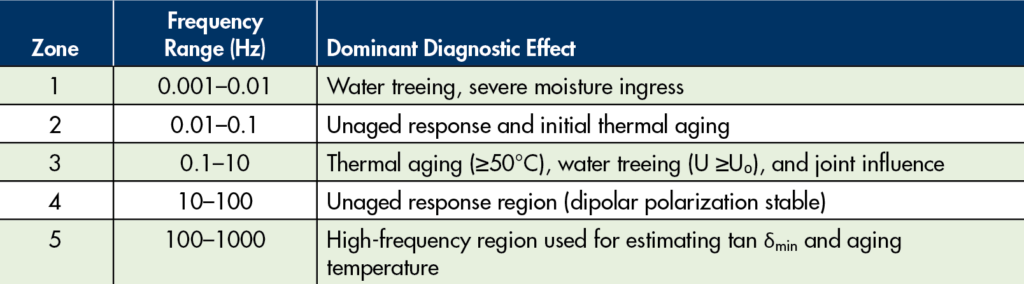 The XLPE insulation response can therefore be segmented into five diagnostic frequency zones (Figure 1), each corresponding to a dominant physical mechanism and distinct degradation behavior (Table 1). This zonal segmentation allows utilities to evaluate tan delta trends with respect to the underlying aging process rather than relying solely on a single-point VLF tan delta at 0.1 Hz.