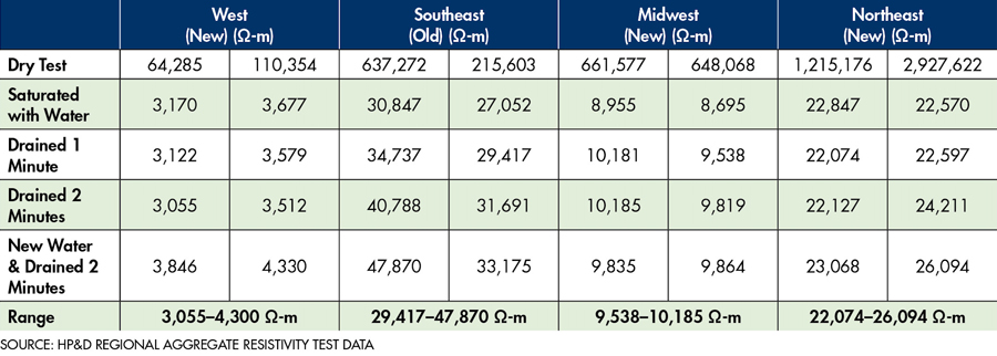 IEEE Std. 80-2013, IEEE Guide for Safety in AC Substation Grounding,outlines “typical surface material resistivities,” but our testing has revealed that the data is incomplete and may not be indicative of aggregate values nationwide. As shown in Table 1, regional samples vary widely; hence, it is necessary to test your aggregate not only per region but also per site, as many factors can affect aggregate resistivity and, therefore, substation safety. Not all utilities in a region may be using the same type of stone, so the values shown in the table are for a specific region, utility, and site.