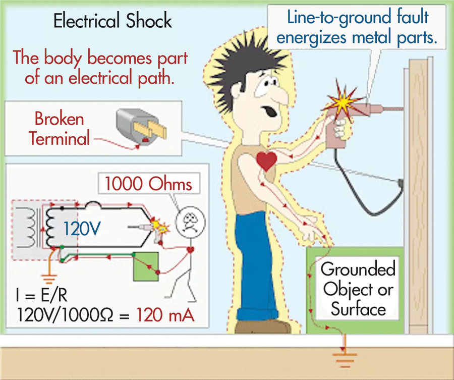 How many of you use drills at home? Do you have that old drill with a plug without a ground? How many of us take our broken tools home—things like extension cords with the ground pulled out. The safety professional says, “Hey, you can’t have those here!” But it’s a new cord, so you take it home, and it happens.