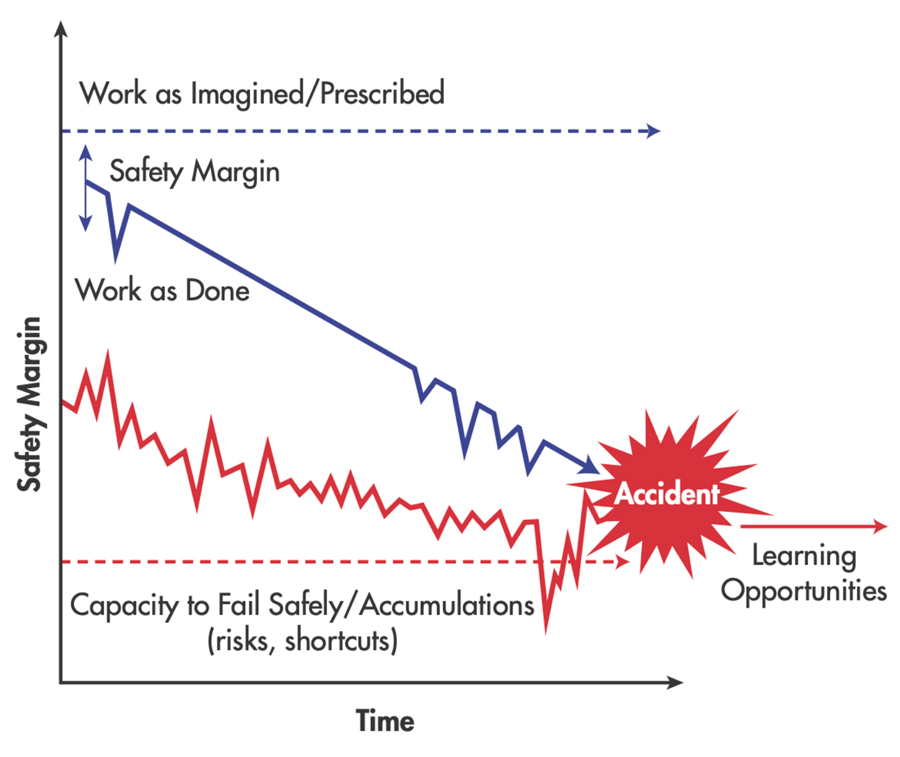 Figure 1 illustrates how this drift can develop over time, as everyday adaptations gradually separate planned work from actual field practice, allowing risk to accumulate unless control is intentionally re-established. The concept is drawn from safety science literature, including Sidney Dekker’s work on drift into failure.[7]